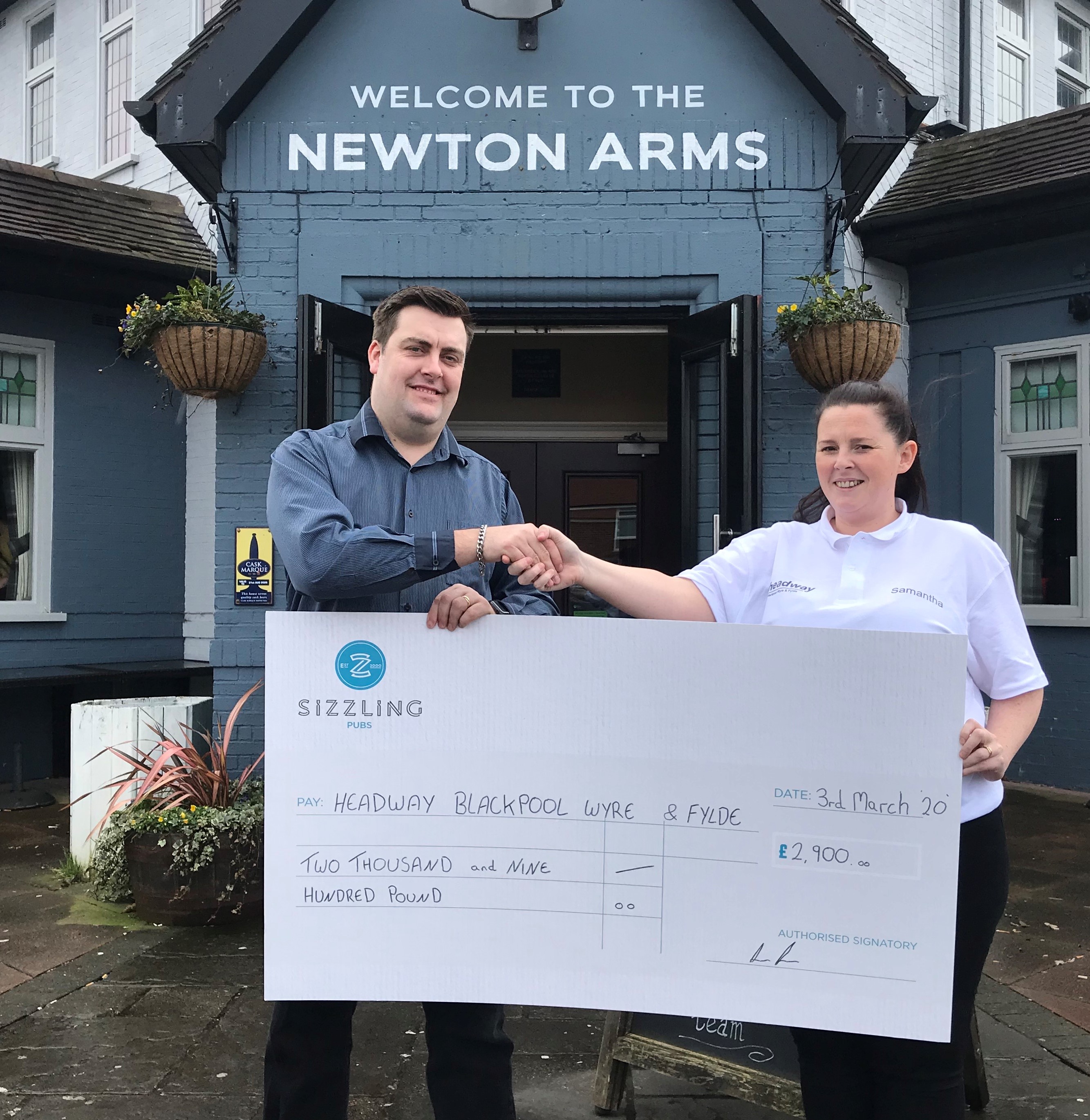 The Newton Arms raised £2,900 over a 12 month period which will pay the annual room hire cost for Headway Blackpool’s weekly drop-in service, along with the summer and Christmas outings.